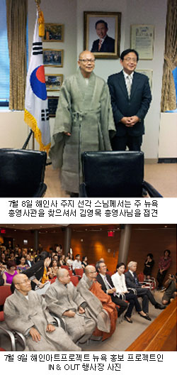 ÇØÀÎ¾ÆÆ®ÇÁ·ÎÁ§Æ® ´º¿å È«º¸ ÇÁ·ÎÁ§Æ®ÀÎ IN & OUT Çà»çÀå »çÁøÀÌ´Ù. Çà»ç´Â ´º¿å¸ÇÇØÆ° ³» ±ÇÀ§ ÀÖ´Â ºÒ±³ ¹Ì¼ú°üÀÎ ·çºó¹Ú¹°°ü(Rubin Museum)¿¡¼ °³ÃֵǾú´Ù. ¿ÞÂʺÎÅÍ ´ºÀúÁö º¸¸®»ç ÁÖÁö ¿ø¿µ½º´Ô, ³ª(Çâ·Ï), ÁÖÁö ¼±°¢½º´Ô, À̿켺 ´º¿åÇѱ¹¹®È¿øÀå, ±èÀ¯¿¬ ¼ö¼®Å¥·¹ÀÌÅÍ, ¾á ¹Ý ¾ËÆæ ·çºó¹Ú¹°°ü ¼ö¼® Å¥·¹ÀÌÅÍ ¼øÀ¸·Î ¾É¾ÆÀÖ´Ù. Šx Á¼®¿¡´Â ÇØÀÎ¾ÆÆ®ÇÁ·ÎÁ§Æ® Âü¿© ÀÛ°¡¿Í ¸¹Àº ÇöÁö ¾ð·Ð»ç ¹× ¿¹¼úÀΰü°èÀÚ ºÐµéÀÌ ÀÚ¸®¸¦ ºû³»¾î ÁÖ¾ú´Ù. ÁÖÁö½º´ÔÀÇ Àλ縻 Áß¿¡¼ ¡°´º¿å ¹®ÈÆÄ¿öÀÇ ¾¾¾ÑÀ» ÇØÀÎ»ç ¿Å°Ü ½É°í ½Í´Ù¡±´Â ¸»¿¡ °ø°¨ÀÌ µé¾ú´Ù. ÀÌ´Â µ¿½Ã¿¡ õ³âÀ» ¸ÂÀº ´ëÀå°æÀÇ Àú·ÂÀ» ´º¿å¿¡ ½É°í ¿Â ³¯À̱⵵ ÇÏ¿´´Ù.