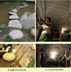 ¾ç ÂÊ ³¡ µÎ ±×¸©¿¡´Â ±Ùó¿¡¼ ãÀ» ¼ö ÀÖ´Â ÀÚ°¥, Àܰ¡Áö, ¾¾¾Ñ, ³ª¹µÀÙ °°Àº ÀÚ¿¬ Àç·áµéÀÌ ´ã°Ü ÀÖ´Ù. ÀÛ°¡´Â ÇØÀλ翡¼ °ü¶÷°´µé¿¡°Ô ºó ±×¸©¿¡ ÀÚ¿¬Àç·áµéÀ» ¿øÇÏ´Â ´ë·Î ´ã°Å³ª ¾ç ÂÊ ³¡¿¡ ä¿öÁ® ÀÖ´ø ±×¸©µéÀÇ Àç·á¸¦ À̵¿½ÃÄѺ¸¶ó°í Á¦½ÃÇÑ´Ù. ÀÌ·± ºñ¿ì±â¿Í ä¿ì±â¶ó´Â ÇàÀ§¸¦ ÅëÇØ¼ ÀÛ°¡´Â °ü°´¿¡°Ô ¾È°ú ¹Û, ¹°Áú°ú ¸¶À½¿¡ ´ëÇÑ ºñ¿ò°ú ä¿ò¿¡ ´ëÇØ ±íÀÌ »ý°¢Çغ¸´Â °æÇèÀ» ¸¸µé¾î ÁØ´Ù.